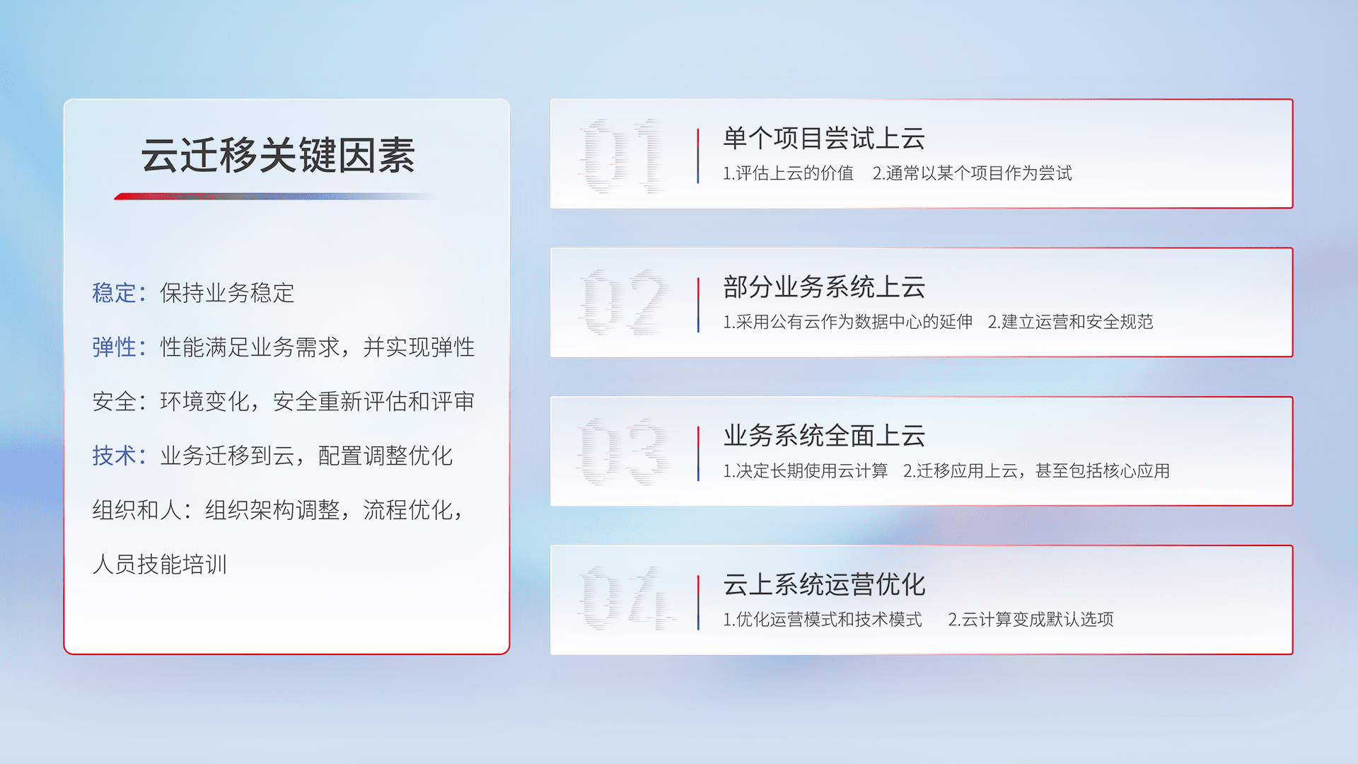 结合实际业务,,,从规划设计、、、云平台选型、、云原生改造、、、数据迁移、、集成交付,,迁移全过程为客户识别最佳上云路径,,做好风险识别管理,,设计网络架构、、身份权限、、、安全审计合规、、、、操作审计、、、日志审计、、监控告警策略、、、、多站点容灾设计等,,,对云上基础设施进行整体规划,,提升IT治理水平,,以满足弹性、、高可用、、高性能的需求。。。。